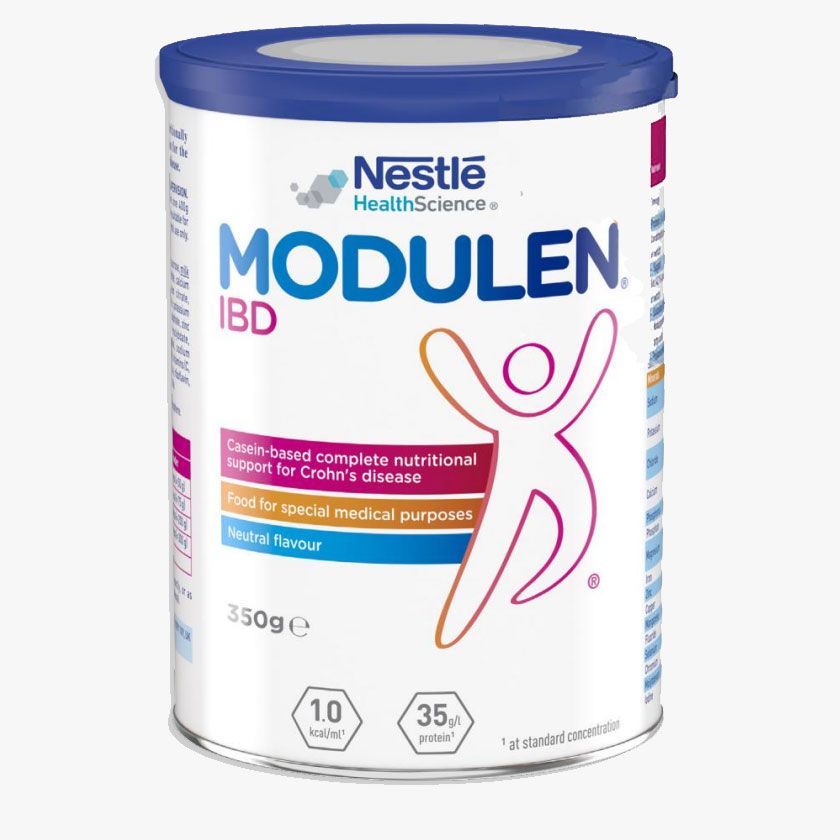 Modulen IBD is a nutritionally complete powdered feed for the dietary management of people with Crohn's disease. It is to be used as a sole source of nutrition during the active phase and is for nutritional support during the remission phase. It is 100% casein-based, supplemented with optimal levels of lipids and carbohydrates with a low osmolality level for good feeding tolerance.